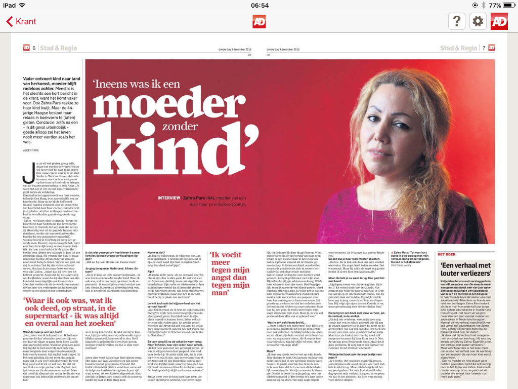 Mijn oud-collega Albert Kok interviewde Zahra over ‘De kamer van mijn zoon’ voor AD Haagse Courant. Het artikel werd 3 december 2015 gepubliceerd. Ik hoop dat ik binnenkort een duidelijker en leesbaarder versie kan tonen.
