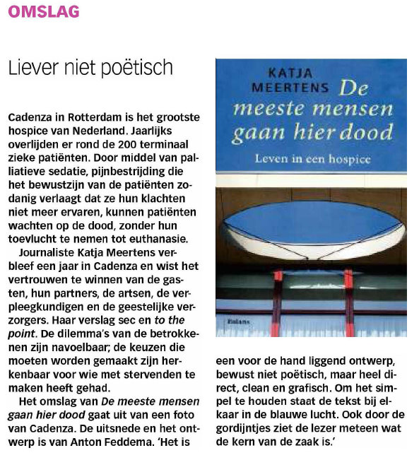 In het boekenkatern van de Volkskrant wordt wekelijks een boekomslag besproken. Ook het omslag van De meeste mensen gaan hier dood kwam aan de beurt. Over de inhoud zei de krant: ‘Haar verslag is sec en to the point. De dilemma’s van de betrokkenen zijn navoelbaar; de keuzen die moeten worden gemaakt zijn herkenbaar voor wie met stervenden te maken heeft gehad.’ Klik hier voor de omslagbespreking.