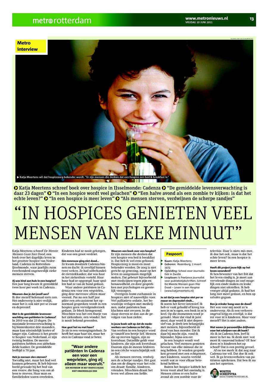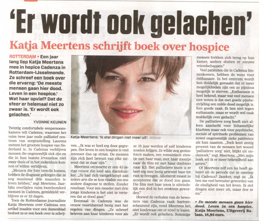 “Zo dicht bij de dood zijn, is heel intens en heel erg bijzonder”, zegt de Rotterdamse schrijfster Katja Meertens in het huis-aan-huisblad de Havenloods van 26 april. Klik hier voor het artikel.