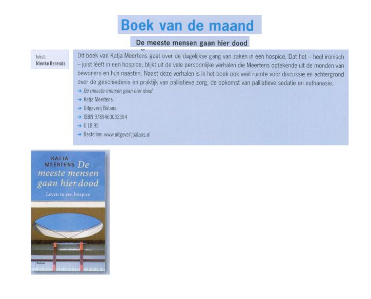 In het vakblad Nursing is De meeste mensen gaan hier dood het Boek van de Maand, zo is te lezen in het kort maar krachtige berichtje. Lees het hier.